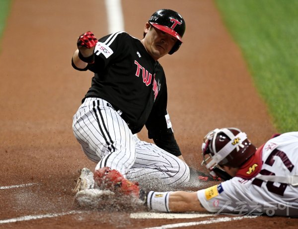 1회초 무사 1, 2루에서 동료의 2루타 때 LG 1루 주자 이형종이 홈득점을 노렸으나 키움 박동원에게 태그 아웃되고 있다.
