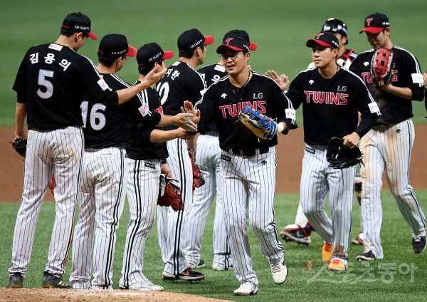 LG가 키움에 6-5로 승리한 뒤 선수들이 그라운드에서 기쁨을 나누고 있다.