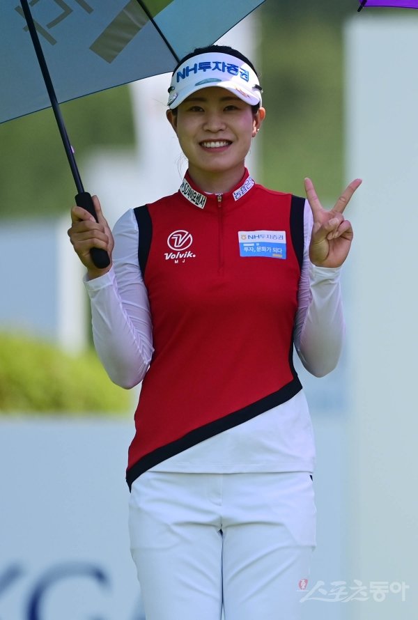 20일 충남 음성군 레인보우힐스CC에서 열린 ‘DB그룹 제35회 한국여자오픈 골프선수권대회’ 4라운드에서 박민지가 1번홀 티샷을 마친 뒤 취재진을 향해 포즈를 취하고 있다.