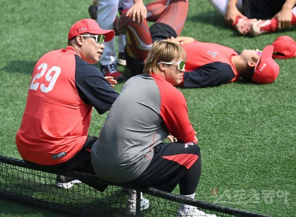 20일 서울 잠실야구장에서 ‘2021 신한은행 SOL KBO리그’ KIA 타이거즈와 LG 트윈스 경기가 열린다. KIA 나지완와 김선빈이 훈련 전 휴식을 취하고 있다.