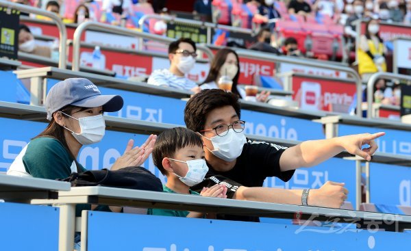 코로나19 사회적 거리두기 완화로 인해 야구팬 가족들이 테이블석에서 경기를 지켜보고 있다.