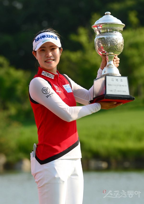 20일 충남 음성군 레인보우힐스CC에서 열린 ‘DB그룹 제35회 한국여자오픈 골프선수권대회’ 4라운드에서 박민지가 17언더파로 우승을 결정지은 뒤 트로피를 들고 기념 촬영을 하고 있다.