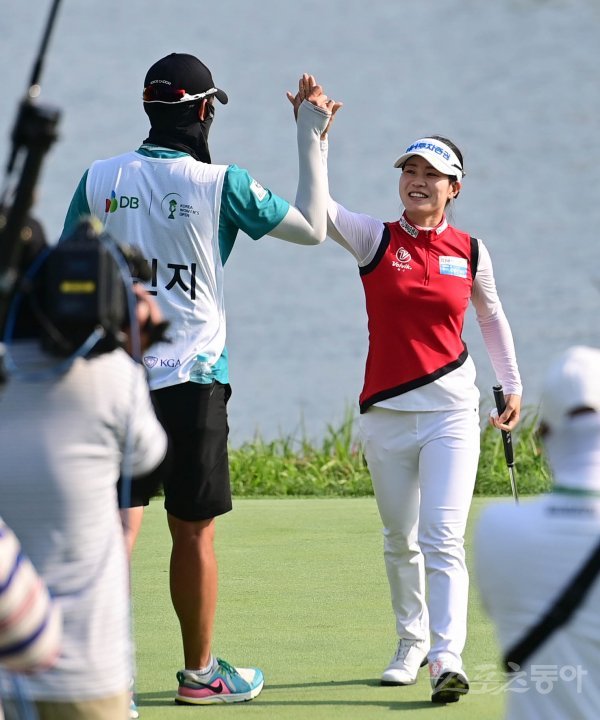 20일 충남 음성군 레인보우힐스CC에서 열린 ‘DB그룹 제35회 한국여자오픈 골프선수권대회’ 4라운드에서 박민지가 17언더파로 우승을 결정지은 뒤 전병권 캐디와 기쁨을 나누고 있다.