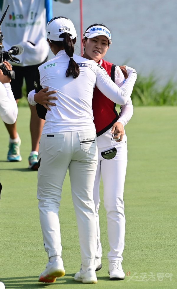 20일 충남 음성군 레인보우힐스CC에서 열린 ‘DB그룹 제35회 한국여자오픈 골프선수권대회’ 4라운드에서 박민지가 17언더파로 우승을 결정지은 뒤 박현경으로부터 축하를 받고 있다.