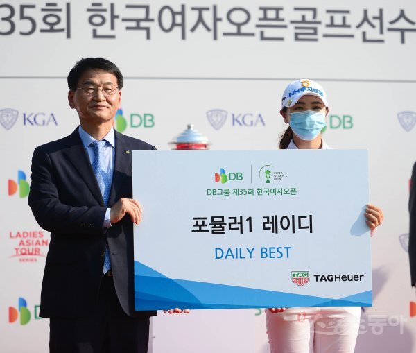 20일 충남 음성군 레인보우힐스CC에서 열린 ‘DB그룹 제35회 한국여자오픈 골프선수권대회’ 시상식에서 이가영이 DB그룹 문덕식 사장으로부터 데일리 베스트상을 수상해 기념 촬영을 하고 있다.