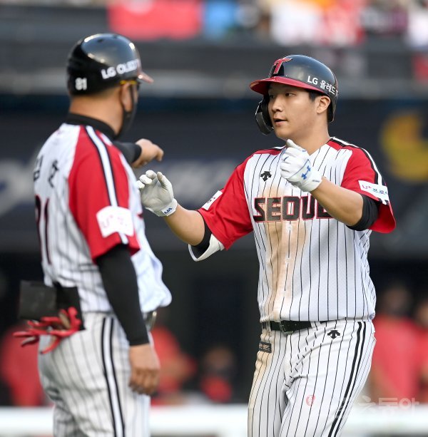 5회말 무사 1루 LG 문보경이 우월 투런 홈런을 날리고 그라운드를 돌아 홈인해 하이파이브 하고 있다.