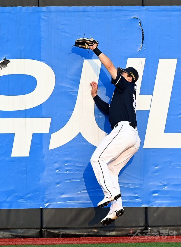 6회말 1사에서 두산 김재환이 펜스와 충도하며 플라이 타구를 잡아내고 있다.