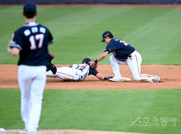 7회말 1사 2루에서 kt 송민섭이 투수 견제 때 황급히 2루로 귀루하고 있다.