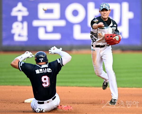 6회초 무사 1루에서 kt 심우준이 두산 1루 주자 페르난데스를 2루에서 포스 아웃시킨 뒤 1루로 송구하고 있다.