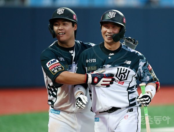8회말 1사 1루에서 kt 박경수가 투런 홈런을 쏘아 올린 뒤 강백호와 기쁨을 나누고 있다.