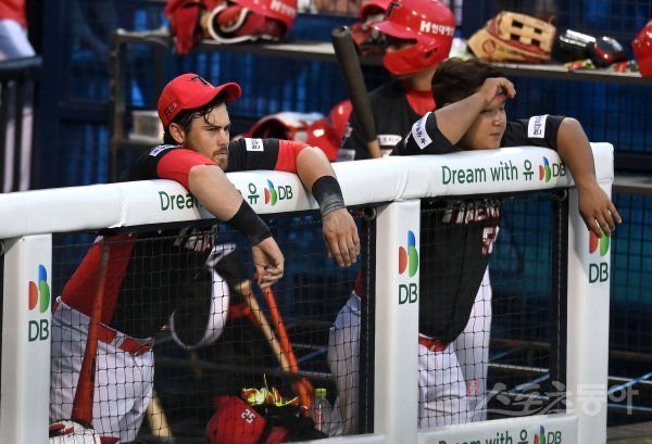 0-6으로 지고 있는 상황에서 KIA 터커가 9회초 공격을 바라보고 있다.