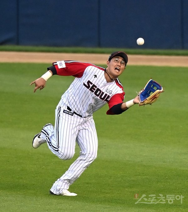 8회초 LG 채은성이 외야 뜬공을 잡고 있다.