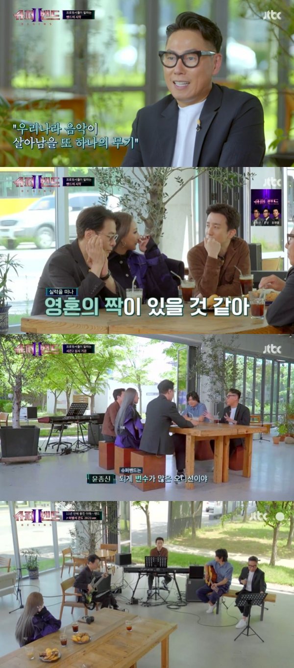 21일 방송한 JTBC \'슈퍼밴드2\'는 \'슈퍼밴드2 비긴즈\'로 시청자들과 첫 만남을 가졌다. 이날 방송에서는 \'슈퍼밴드\' 원년 멤버이자 오디션 베테랑인 윤종신과 윤상, 새롭게 합류한 또 다른 오디션 고수 유희열, 그리고 첫 고정 예능에 나선 이상순과 씨엘이 참가자 오디션을 앞두고 한 자리에 모였다.