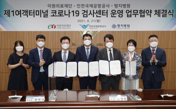 인천국제공항공사(사장 김경욱)는 21일 이원의료재단(이사장 이덕구), 명지의료재단 명지병원(이사장 이왕준) 등과 ‘인천공항 제1여객터미널 코로나19 검사센터 운영 협약’을 체결했다. 인천국제공항공사는 협약을 바탕으로 제1여객터미널 교통센터 1층 야외지역에 코로나19 검사센터 2개소(동·서편 각 1개소)를 8월 중 오픈해 운영할 예정이다.