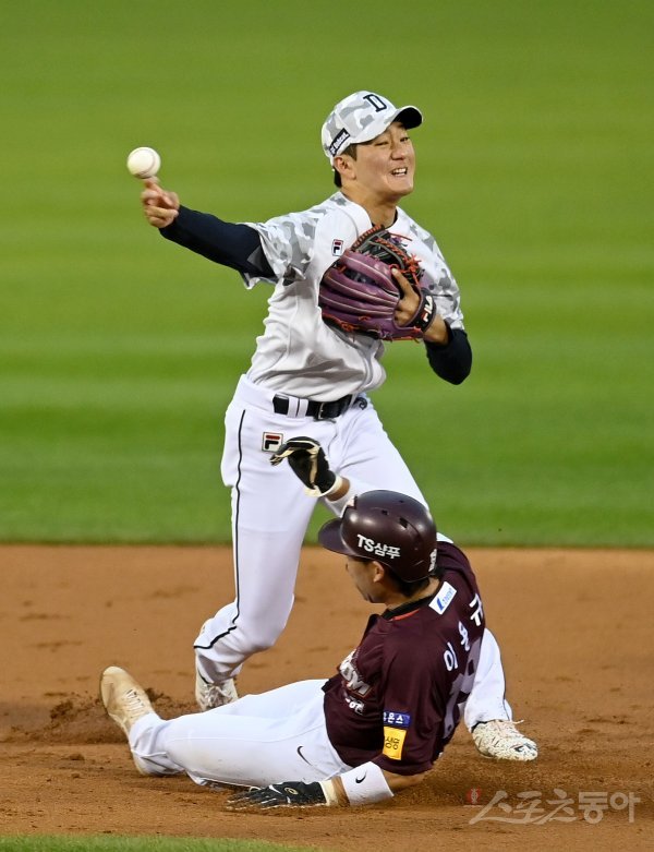 22일 서울 잠실야구장에서 ‘2021 신한은행 SOL KBO리그’ 키움 히어로즈와 두산 베어스 경기가 열렸다. 2회초 1사 1루 키움 내야 땅볼 때 두산 안재석이 1루주자를 포스 아웃시킨 후 1루로 송구하고 있다.
