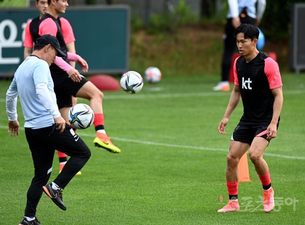 22일 경기도 파주NFC(축구국가대표트레이닝센터)에서 열린 도쿄올림픽 2차 소집훈련에 참석한 올림픽축구대표팀 김학범 감독이 정우영과 볼을 차고 있다.