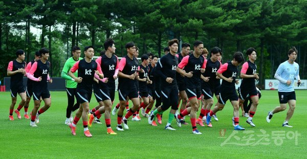 22일 경기도 파주NFC(축구국가대표트레이닝센터)에서 열린 도쿄올림픽 2차 소집훈련에 참석한 올림픽축구대표팀 선수들이 가볍게 몸을 풀고 있다.