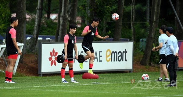 22일 경기도 파주NFC(축구국가대표트레이닝센터)에서 열린 도쿄올림픽 2차 소집훈련에 참석한 올림픽축구대표팀 선수들이 체력 훈련을 하고 있다.