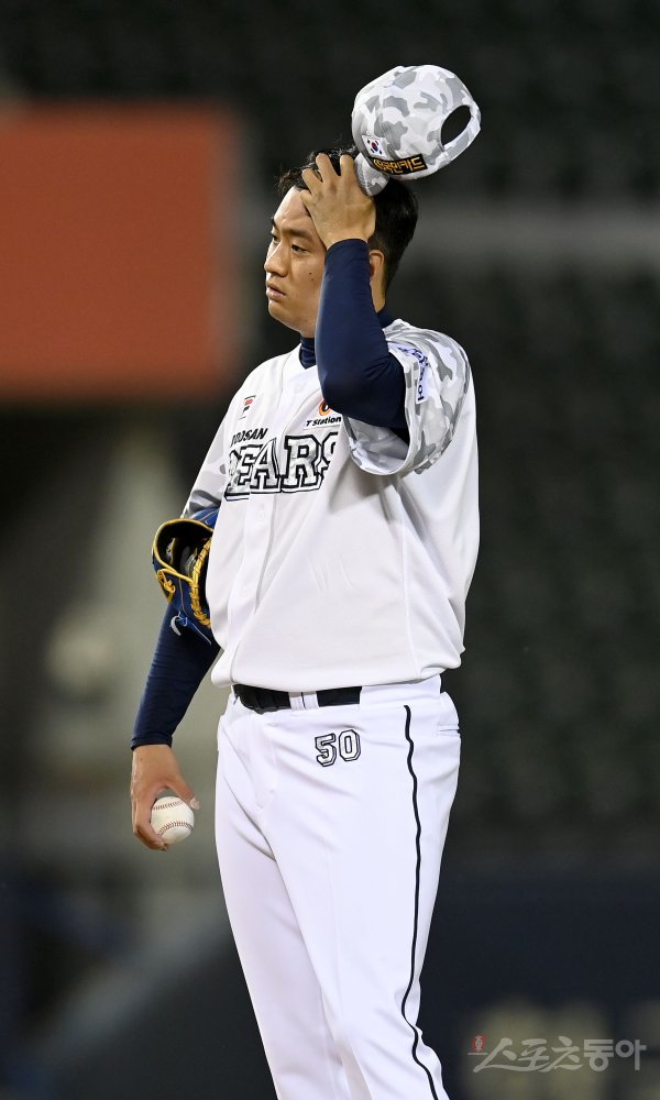 선발 투수로 등판한 두산 이영하가 5회초 1사 만루 상황에서 교체되고 있다.