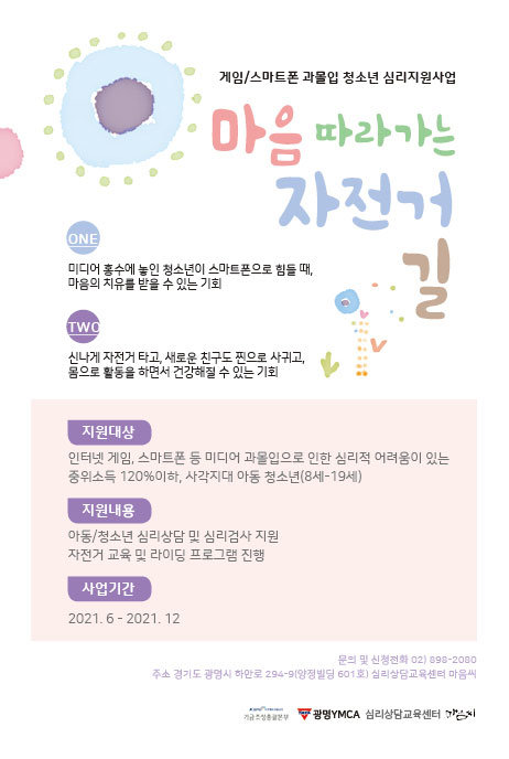 수시모집이며 ‘광명YMCA 심리상담교육센터 마음씨’에 전화하면 된다. 12월까지 진행하고 이 기간 개인심리상담 13회과 이론교육과 주행자세 및 안전한 주행습관 등 기초교육을 실시한 뒤 2회에 걸쳐 자전거 라이딩을 하게 된다.