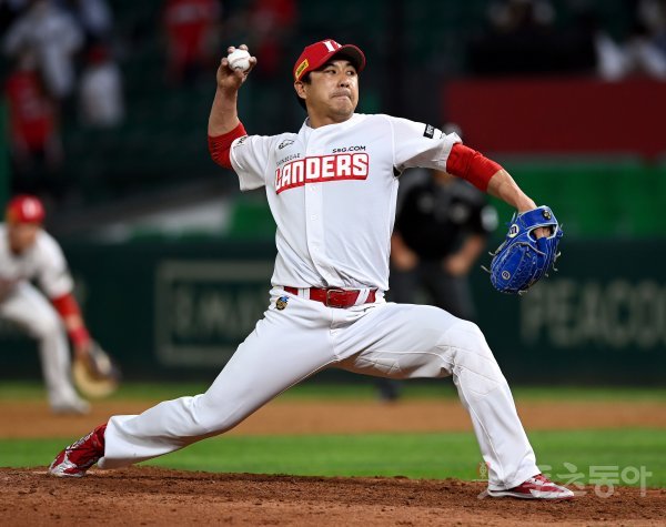 9회초 1사에서 SSG 김강민이 구원 등판해 볼을 던지고 있다.