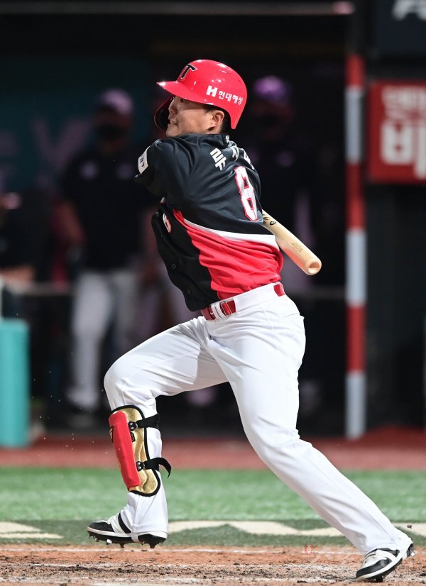 7회초 2사 KIA 류지혁이 내야 땅볼을 치고 있다.