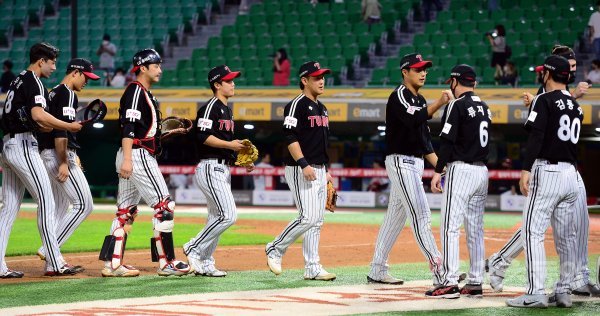 LG가 SSG에 14-1로 승리하며 5연승을 기록한 뒤 선수들이 류지현 감독의 환영을 받고 있다.