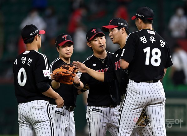 LG가 SSG에 14-1로 승리하며 5연승을 기록한 뒤 선수들이 그라운드에서 기쁨을 나누고 있다.