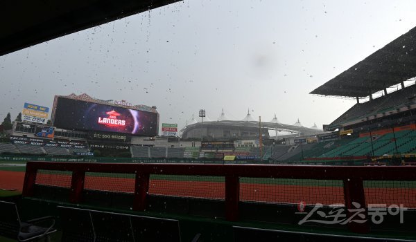 경기 전 갑작스런 폭우가 쏟아지고 있다.