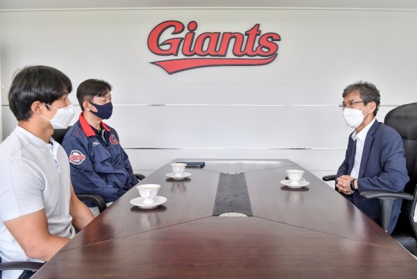 이병진 부산시 행정부시장(오른쪽)이 23일 사직구장을 찾아 롯데 이석환 대표이사, 성민규 단장과 간담회를 갖고 있다. 사진제공|부산시