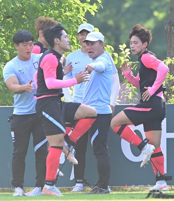 23일 경기도 파주 축구대표팀트레이닝센터(NFC)에서 2020 도쿄올림픽 2차 소집훈련에서 올림픽 축구대표팀 김학범 감독이 선수들의 훈련을 지켜보고 있다.