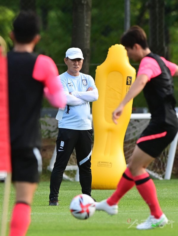 23일 경기도 파주 축구대표팀트레이닝센터(NFC)에서 2020 도쿄올림픽 2차 소집훈련에서 올림픽 축구대표팀 김학범 감독이 선수들의 훈련을 지켜보고 있다.
