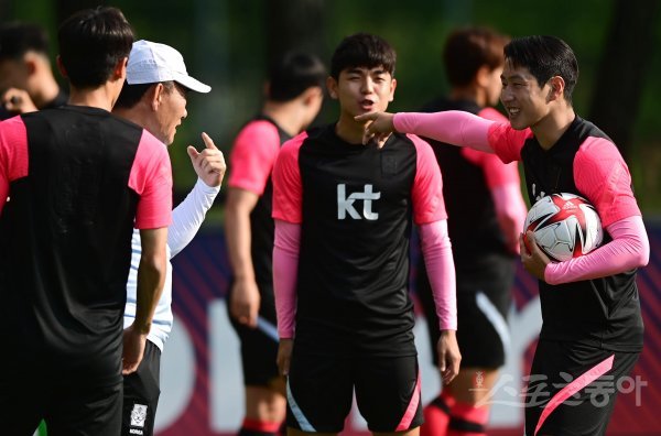 23일 경기도 파주 축구대표팀트레이닝센터(NFC)에서 2020 도쿄올림픽 2차 소집훈련에서 올림픽 축구대표팀 이강인이 훈련에 앞서 김학범 감독과 이야기를 하고 있다.