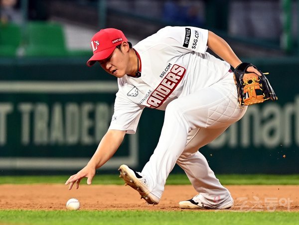 5회초 2사 2루에서 SSG 김찬형이 내야땅볼 타구를 실책하고 있다.