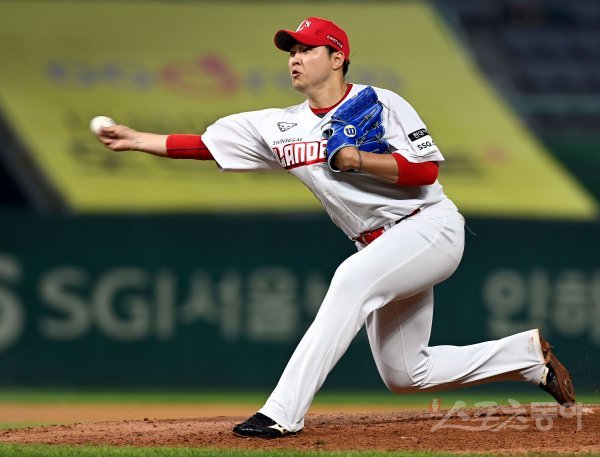6회초 무사에서 SSG 박민호가 구원 등판해 볼을 던지고 있다.