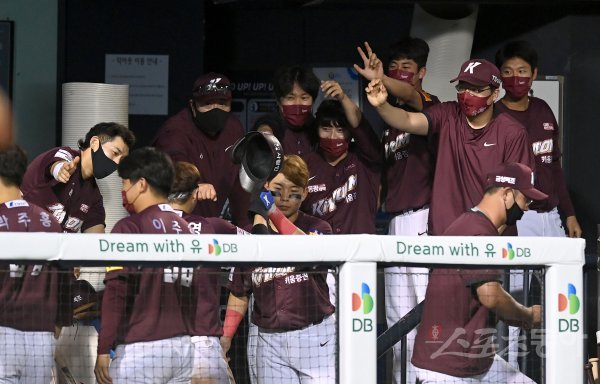 9회초 2사 3루 키움 적시타 때 득점한 3루주자 이지영이 더그아웃에서 하이파이브 하고 있다.
