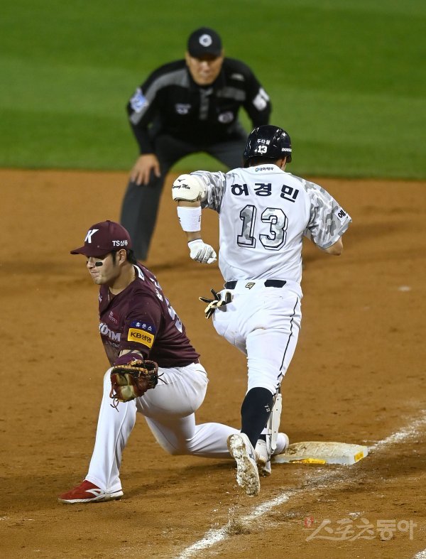 9회말 1사 두산 허경민이 내야 땅볼을 치고 1루에서 아웃되고 있다.