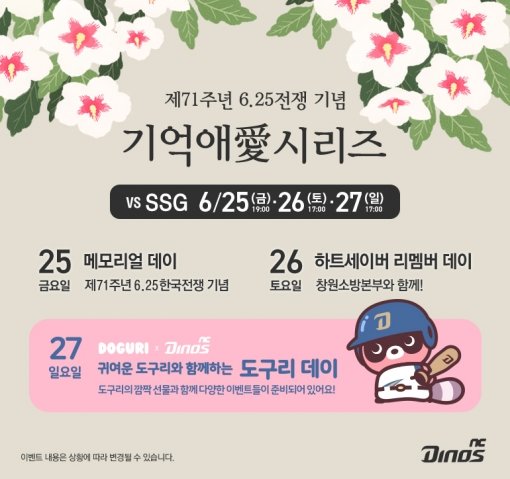 NC 다이노스가 25일(금)부터 27일(일)까지 열리는 SSG와의 주말 홈 세경기에 각각 이벤트를 진행하고 이를 ‘기억애(愛) 시리즈’로 이름붙였다.