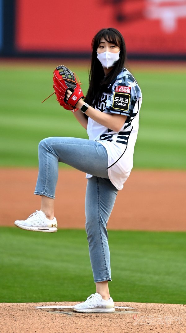 경기 전 현대건설 배구단 황민경이 시구를 하고 있다.