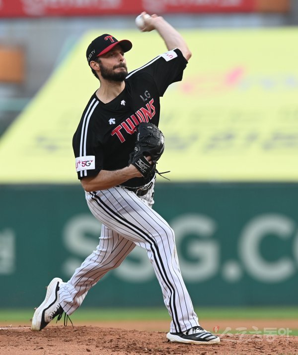 LG 선발투수 수아레즈가 힘차게 볼을 던지고 있다.