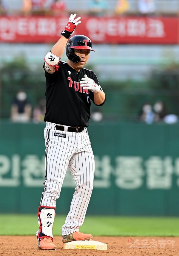 3회초 1사 1루에서 LG 김현수가 1타점 2루타를 날린 뒤 세리머니를 펼치고 있다.