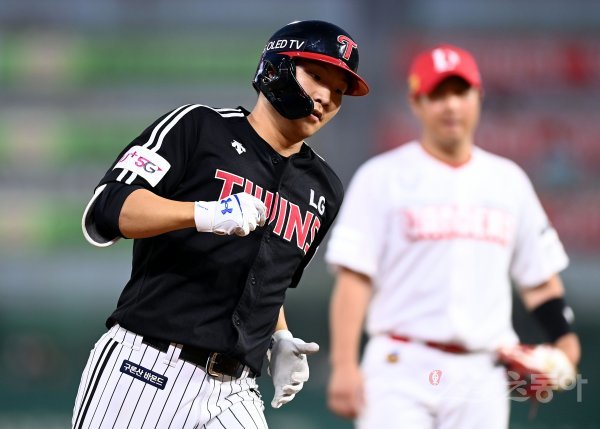 6회초 무사에서 LG 문보경이 솔로 홈런을 쏘아 올린 뒤 그라운드를 돌고 있다.