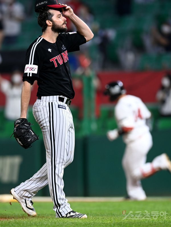 6회말 2사에서 LG 선발 수아레즈가 솔로 홈런을 허용한 뒤 아쉬워하고 있다.