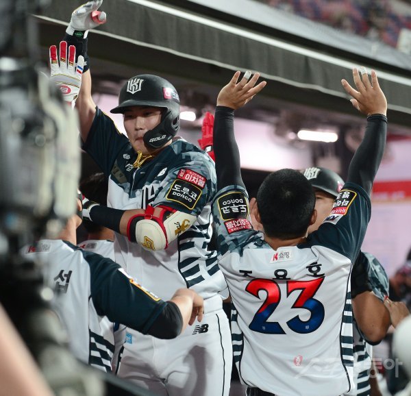 6회말 무사 1루 KT 배정대가 좌월 투런 홈런을 날리고 그라운드를 돌아 홈인해 하이파이브 하고 있다.