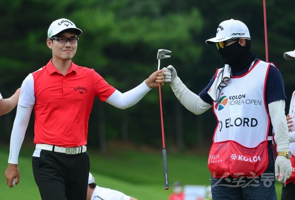27일 충청남도 천안시 우정힐스컨트리클럽에서 열린 ‘코오롱 제63회 한국오픈골프선수권대회’ 4라운드에서 현정협이 9번홀에서 파를 기록한 뒤 캐디와 기쁨을 나누고 있다.