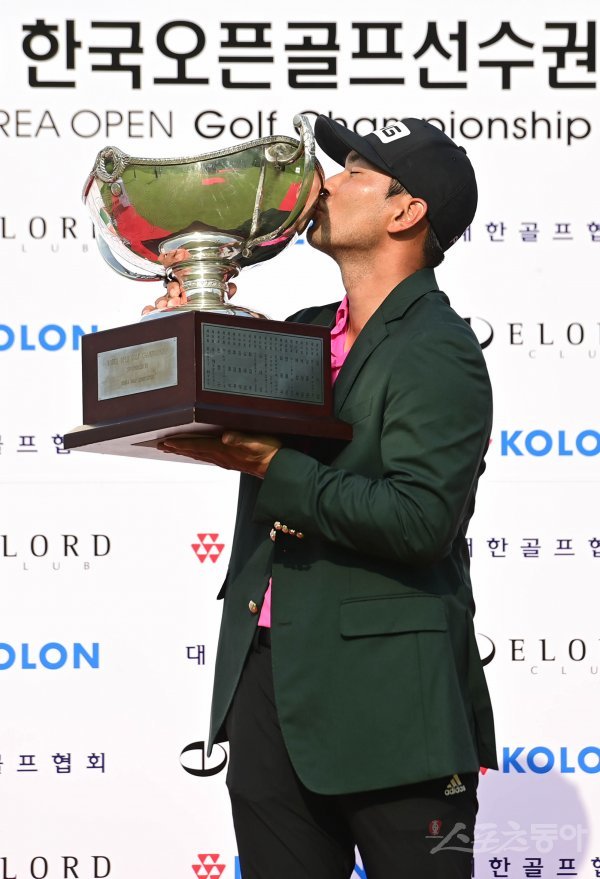 27일 충청남도 천안시 우정힐스컨트리클럽에서 열린 ‘코오롱 제63회 한국오픈골프선수권대회’에서 이준석이 8언더파로 우승을 확정지은 후 시상식에서 우승 트로피를 들고 있다.