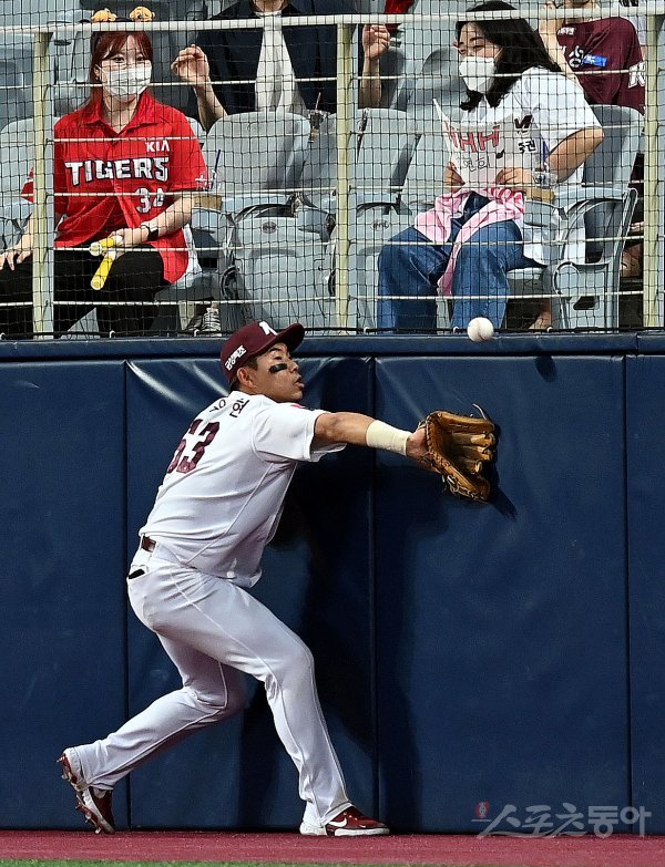 6회초 1사 2, 3루에서 키움 송우현이 파울 타구를 잡으려고 수비하고 있다.