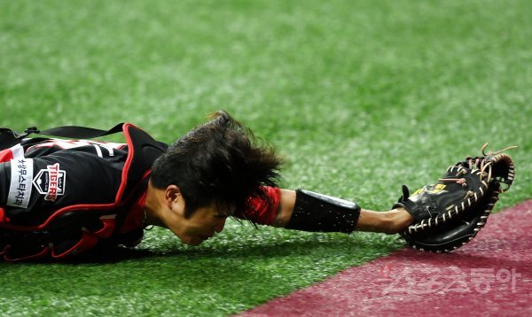 9회말 무사 1루에서 KIA 김민식이 번트 파울타구를 잡기 위해 몸을 날리고 있다.