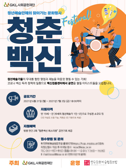 GKL사회공헌재단(이사장 이덕형)은 전국 코로나19 백신접종센터에서 공연을 펼칠 청년예술단체를 모집한다.GKL사회공헌재단이 주최하고 한국문화예술협동조합이 운영하는 ‘청년예술단체의 찾아가는 문화행사 ¤ 청춘백신’ 사업의 일환이다. 코로나19로 공연을 하기 어려운 상황 속에서 청년예술가들이 무대를 향한 열정과 재능을 마음껏 펼칠 수 있는 공연의 기회를 제공하는 위해 기획했다.
