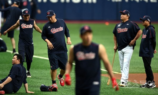 코로나19 밀접촉자로 분류돼 자가격리에 들어간 롯데 서튼 감독의 부재 속에 롯데 최현 코치(오른쪽)가 선수들의 훈련을 지켜보고 있다.